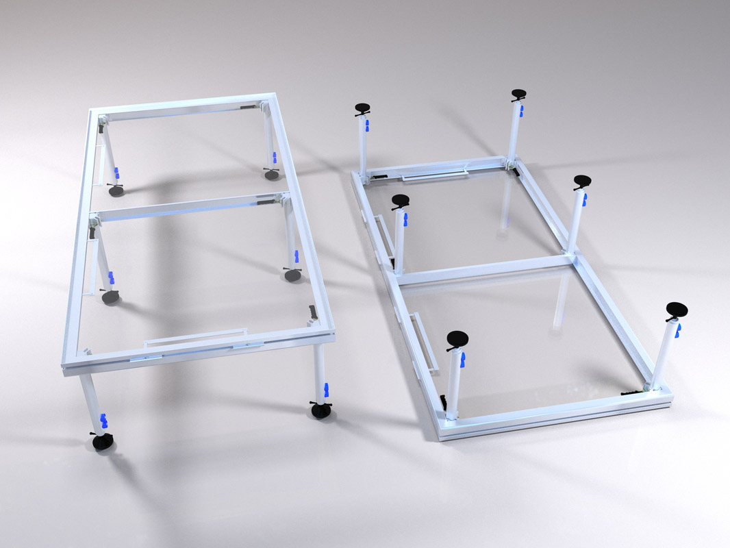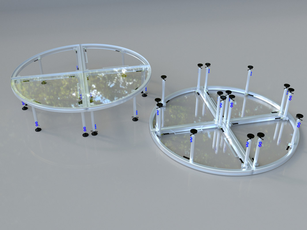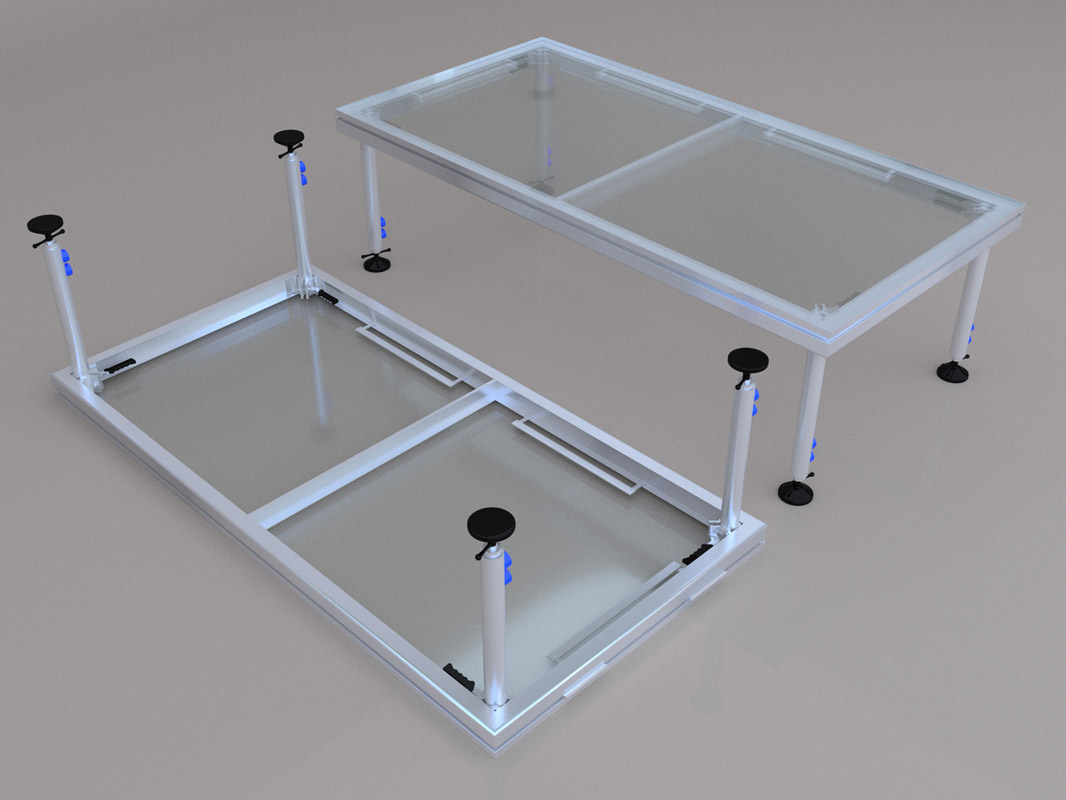 STB系列亚克力舞台,由我司专利定制开模边框和伸缩腿组成。舞台与舞台之间的拼接由专利设计定制开模的锁钩完成。此锁钩不仅可将舞台与舞台之间稳定相接,更可以再次增强舞台承重。每一张舞台设计为两公边,两母边。公边与母边锁钩锁紧即可。操作简便,无需任何工具。