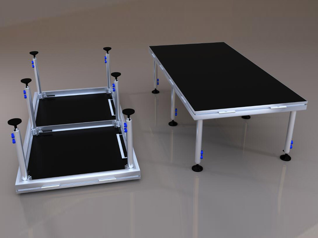 舞台伸缩腿的新型实用性专利设计,可满足不同高度范围的调节。舞台伸缩腿和脚杯的设计可满足坑洼不平的地面,脚杯可倾斜,30°范围内可调。加厚环保橡胶脚杯可保护地面不受损。当需要移动舞台时,可随时将调节脚杯更换为万向轮。