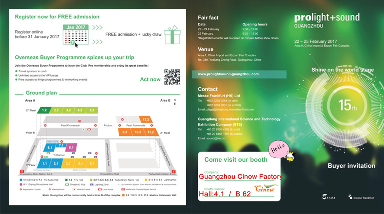Cinow Booth No is Hall 4.1 / B62 in the 2017 Prolight + Sound Guangzhou (PLSG) .